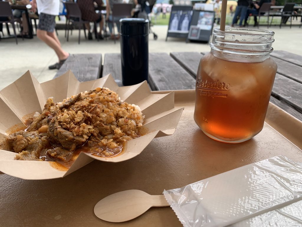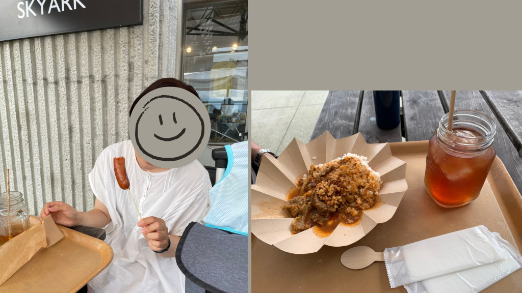 ゴンドラを降りた右側には大きな建物「山頂スカイアーク」があり、ここで「Skyark Deck Café」のお店のカレーとソーセージ(チョリソー)を楽しみました。