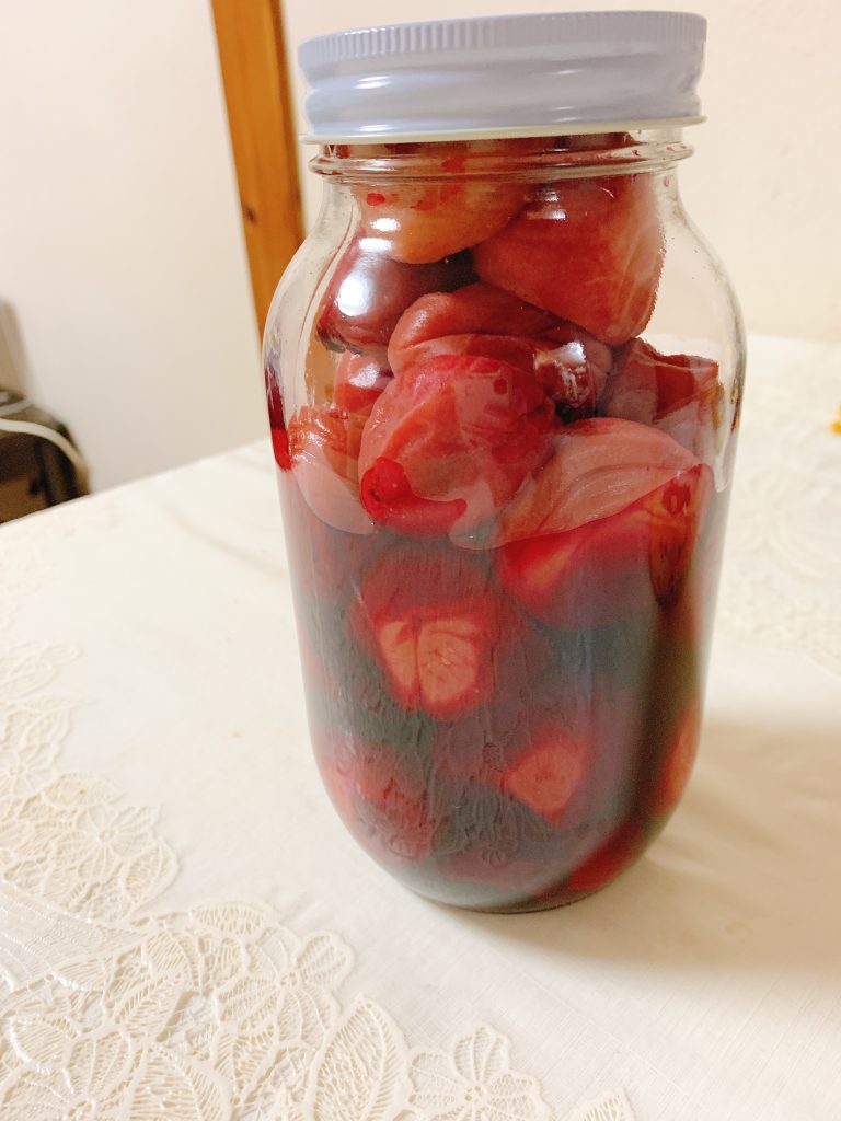 3. 1週間くらいしてから、市販の塩漬け赤しそを加える。