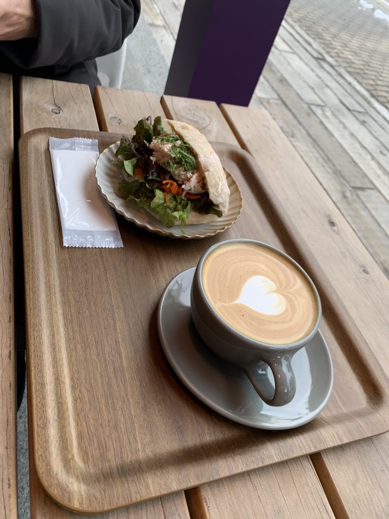 ランチタイムは大人気で混雑していましたが、店員さんがしっかり案内してくれました!テラス席に通してもらい、ラテと一緒にランチ♪
