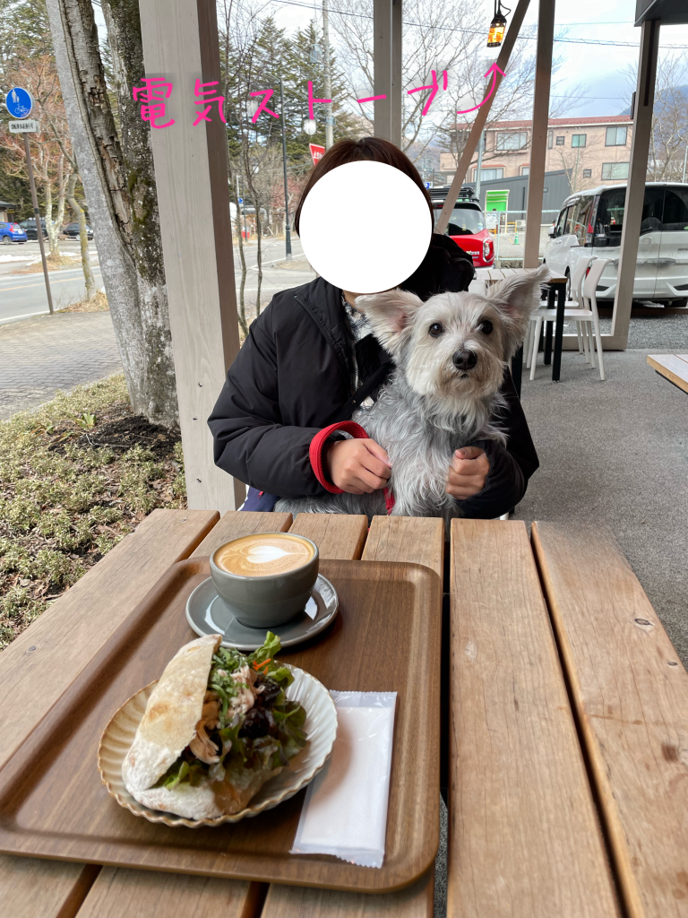 テラス席は犬連れにも優しい設計で、木々に囲まれた落ち着いた雰囲気が最高。ラテもリラックスして過ごしていました。旧軽井沢の道に面しているけど、道からは少し離れていて落ち着いた雰囲気。